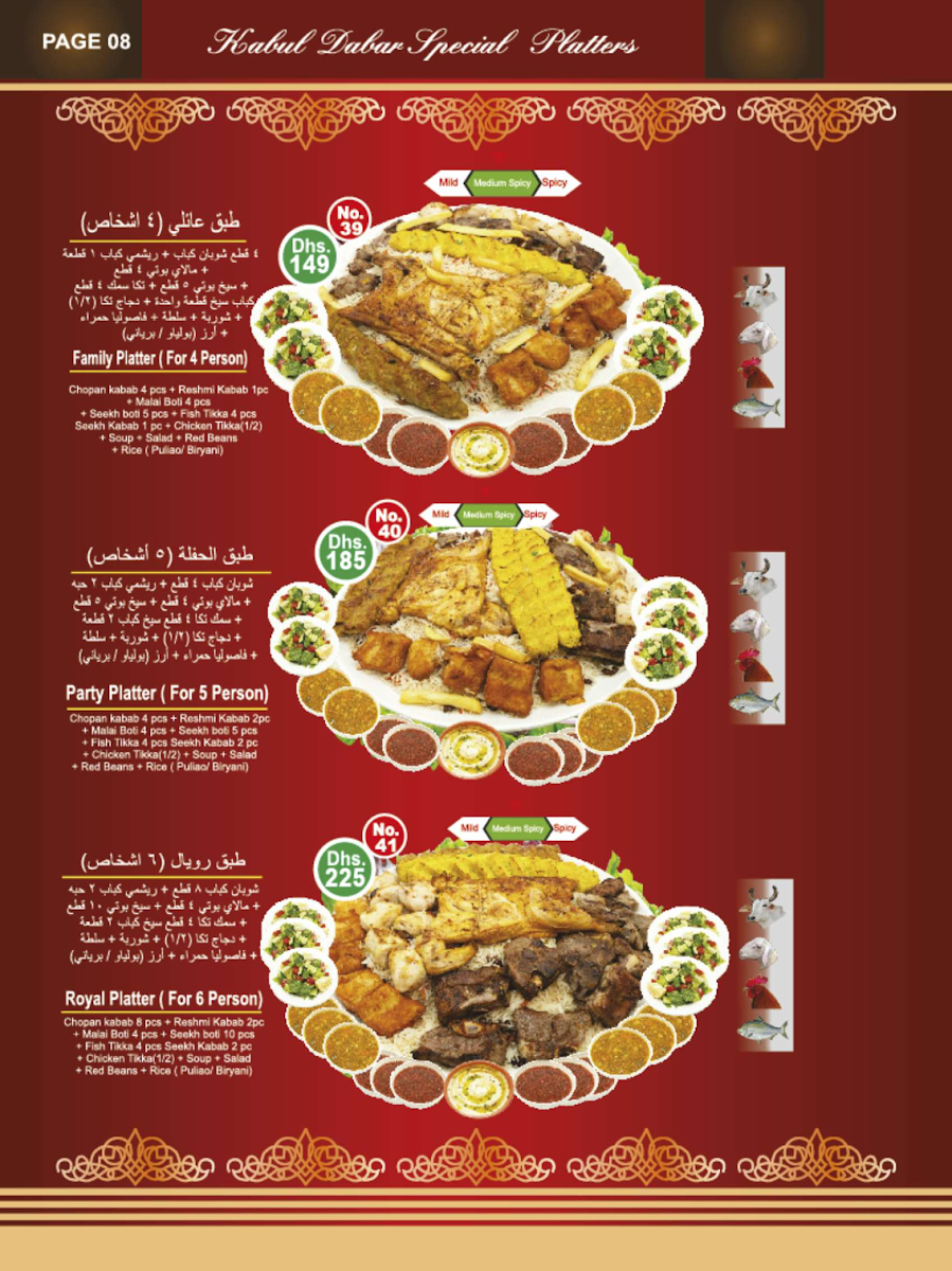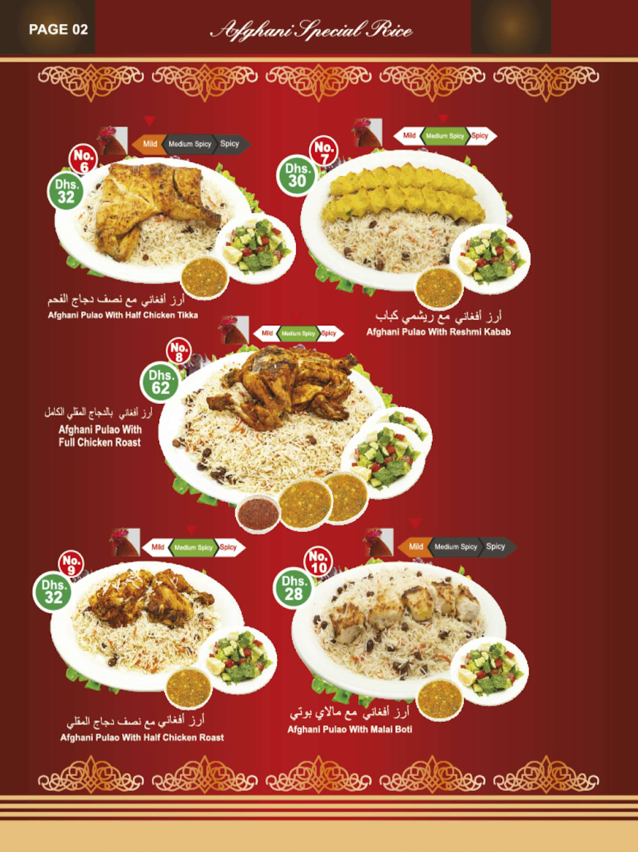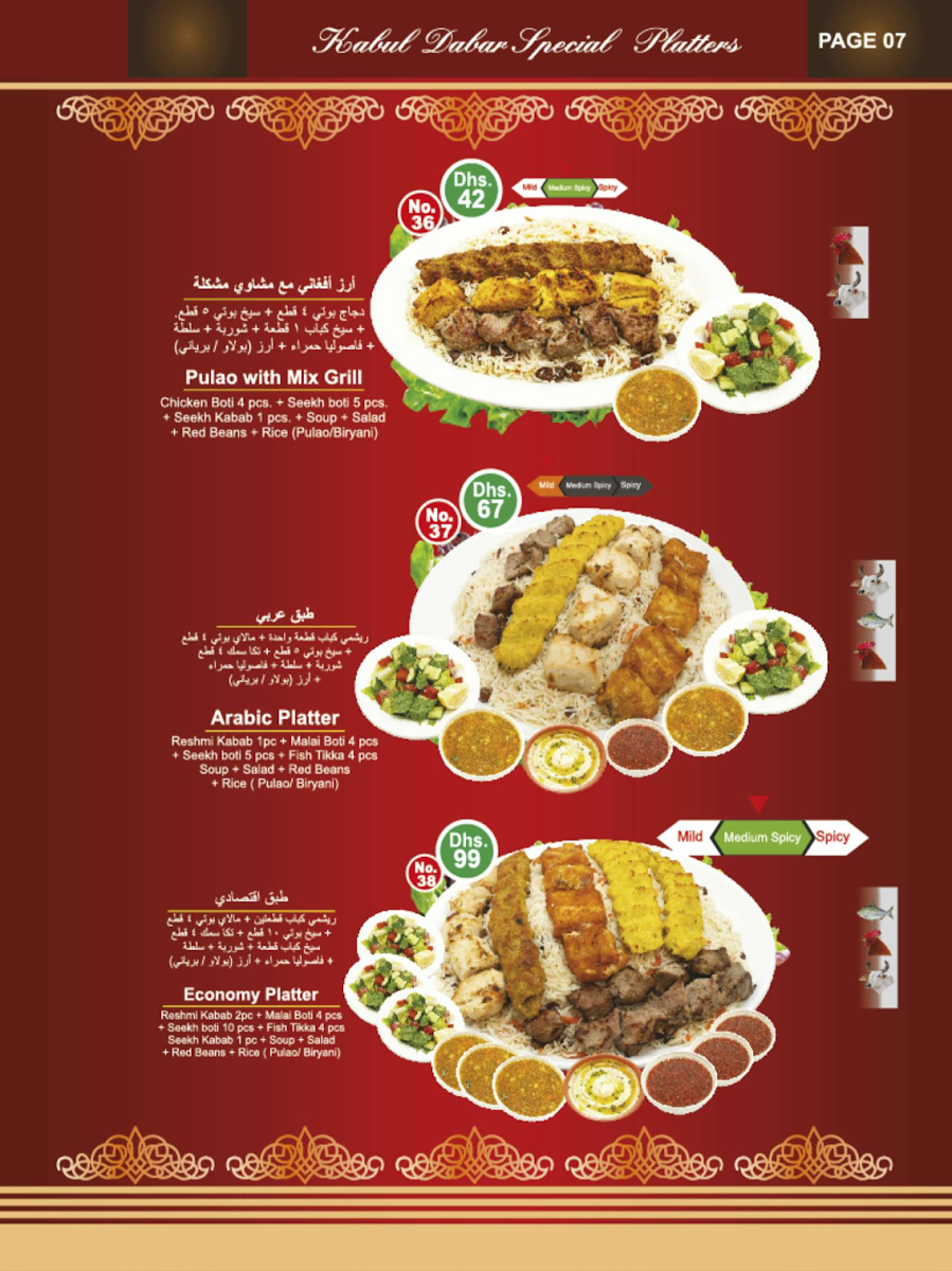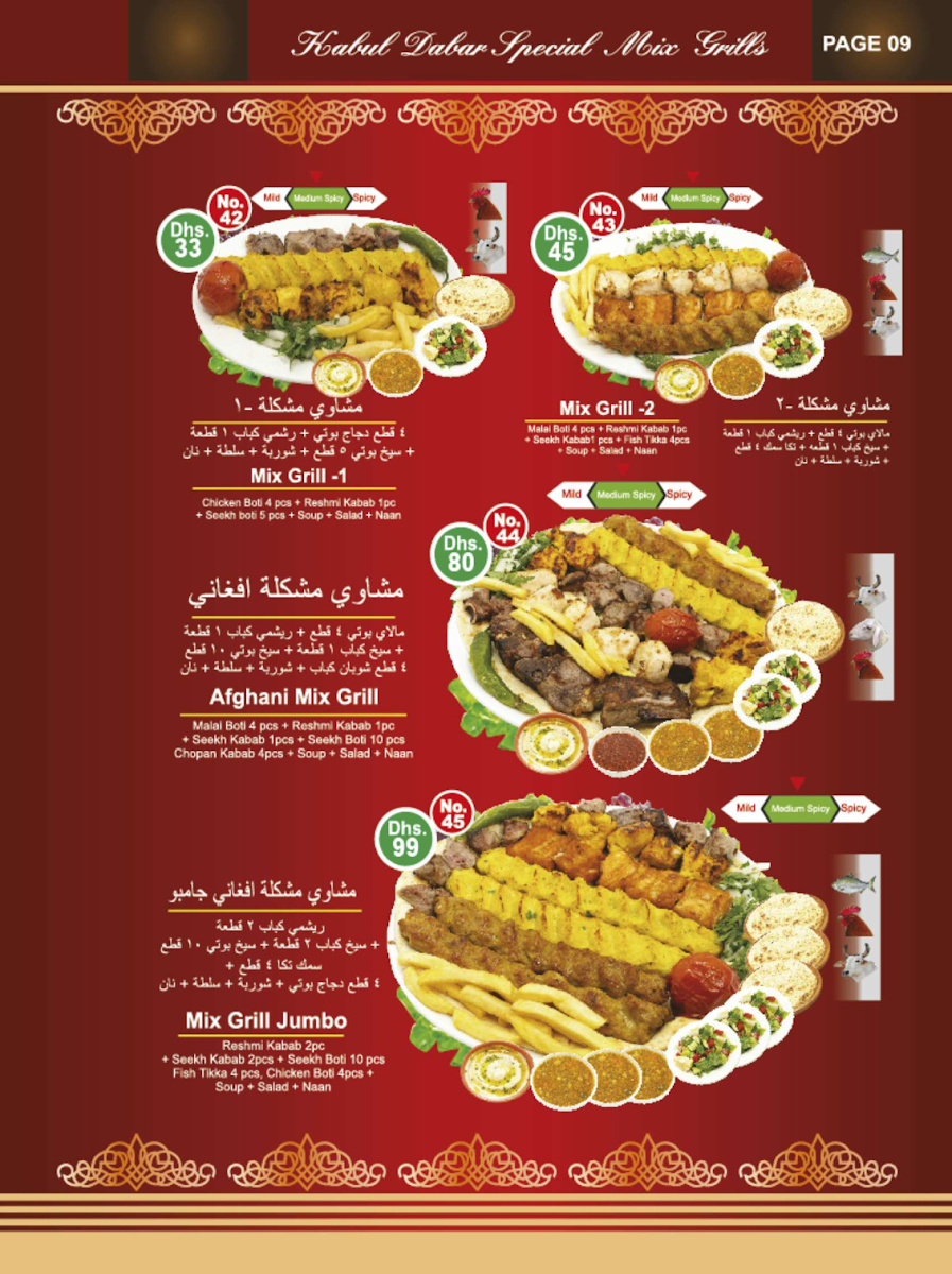 Kabul Darbar Restaurant in Deira, Dubai, offers a rich dive into authentic Afghan cuisine that delights both the palate and the soul. Their menu shines brightest with the Yakhni Pulao series—succulent slow-cooked beef or chicken atop fragrant, seasoned rice, showcasing traditional Afghan cooking at its finest. For grill enthusiasts, the Kabul Darbar Special Mix Grills present a generous assortment of juicy kababs like Malai Boti, Reshmi Kabab, Seekh Boti, and Chopan Kabab, paired perfectly with warm naan, fresh salads, and flavorful soups.